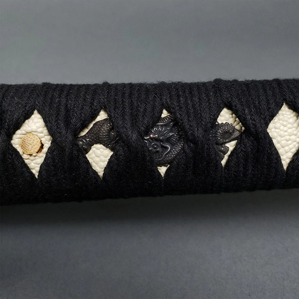 A unique feature is the integrated Bo-Hi on the blade. Bo-Hi is commonly known as blood grooves, but that is a common misconception. The purpose of the Bo-Hi is to help reduce the weight of the katana, it actually has nothing to do with channeling the blood. Making the Katana lighter enables the user to wield the katana better and puts less stress on the hands. Not to mention it benefits some advance cutting techniques that requires the katana to change direction rapidly.