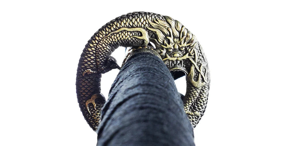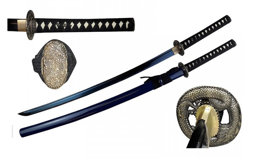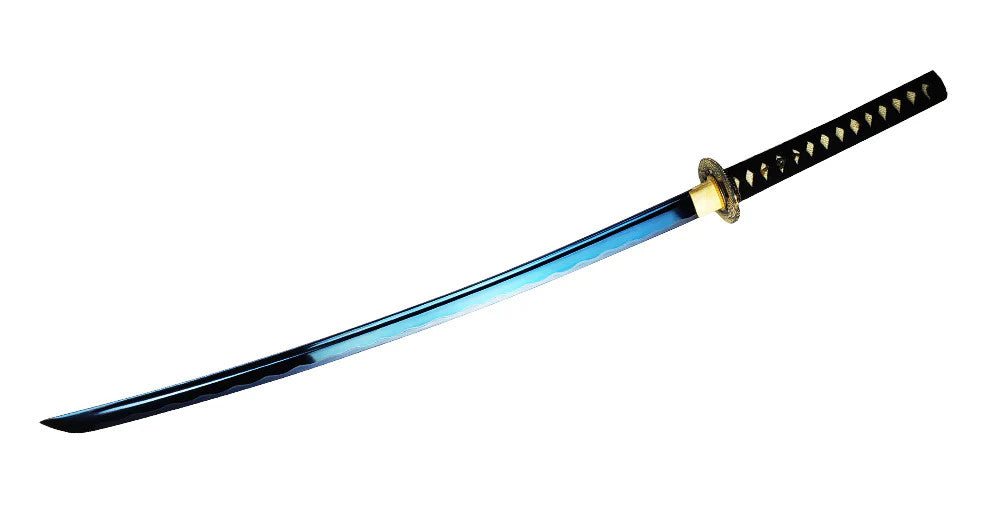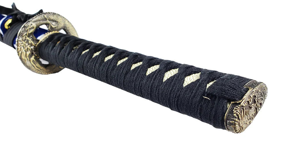Blue color themed katana with Maru Gata style tsuba. The detail tsuba depicts the mythical water dragon Mizuchi as it surrounds the katana. In Japanese mythology the Mizuchi is perceived as a water deity who controls the fierce seas. Beautiful blue anodized pattern effect on the blade gives the katana a distinct and unique look.