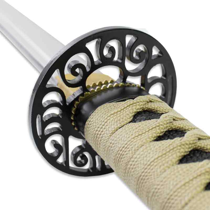 From the Musha Collection comes this intricately hand forged "Orchid" katana. This 41" hand-forged samurai sword is part of the Kotodu series and designed with a 1045 carbon stainless steel blade, razor sharp and guaranteed to last. With an overall length of 41", this sword also features a Muku-Gitae temper line and a black scabbard. Detailed Maru gata style tsuba embodies elegancy, and simplicity that will undoubtedly impress. Real wood handle is wrapped with traditional dusty gold cotton. The wood saya is finished with gold accents. Designed to be a fully functional katana, the Seiryu Katana with its quality build will astonish you with its value. Its combination of precision and strength make it an ideal choice for combat or ritual use. An elevated design that will undoubtedly attract the most demanding collector.