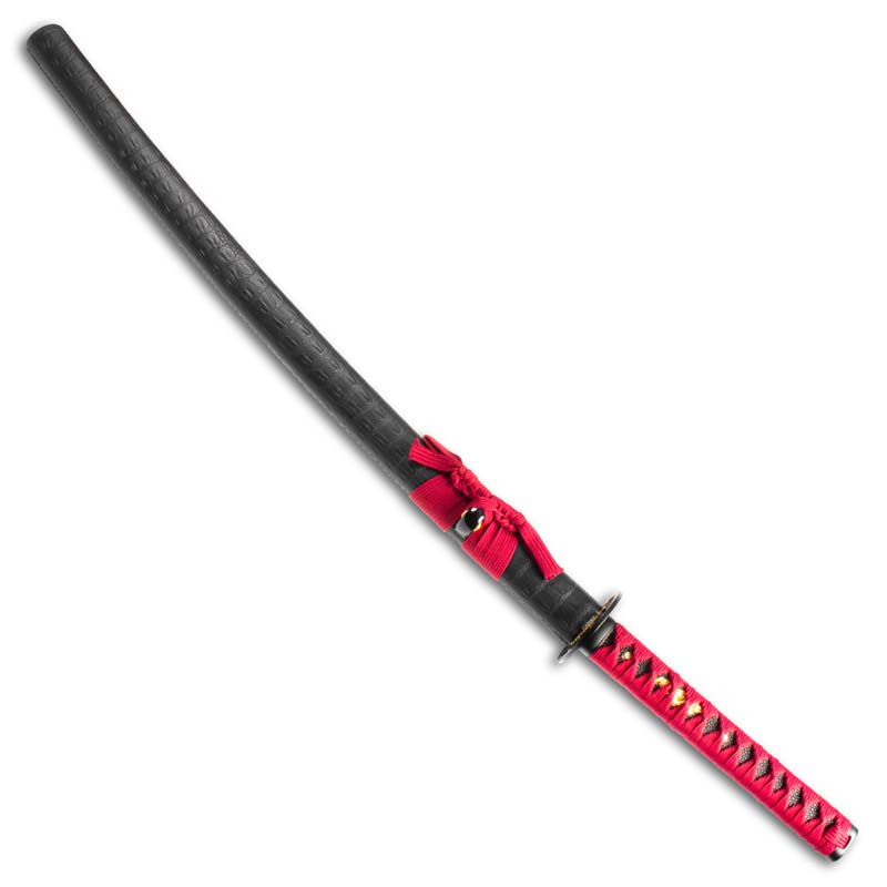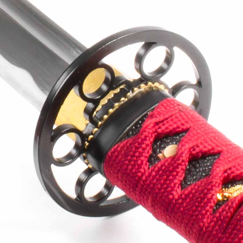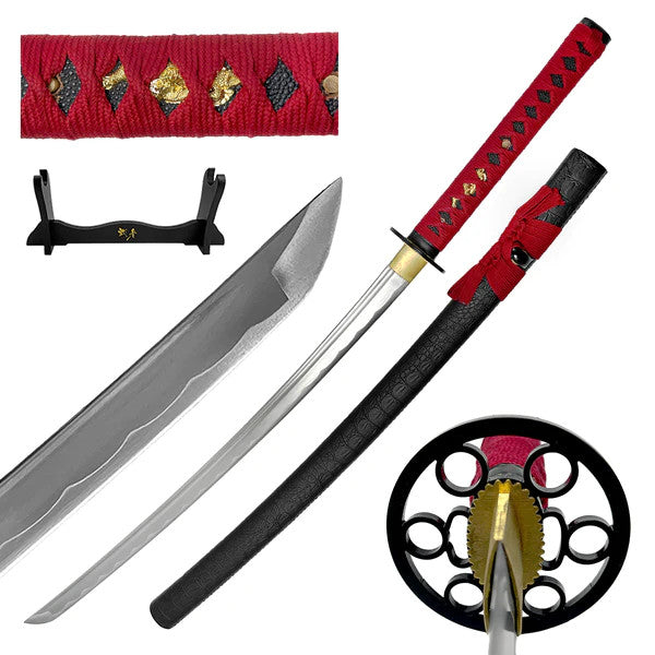 From the Musha Collection comes this intricately hand forged “Enso” (Circles) Katana. The Full tang 1045 high carbon steel makes this a resilient katana that is sharp right out of the box. The blade features a aesthetic hamon line and a blood groove along the spine. The detailed tsuba depicts 8 circles around the tsuba which represents the eight virtues of Bushido. It reminds the Samurai that the way of the warrior as well as karma always comes full circle. Thus you must live your life true to the bushido code. The Enso Circle Katana also features metal fuchi and kashira. The wood handle is wrapped in red nylon cord with a gold dragon menuki underneath. The saya is wood with a black crocodile skin pattern and a red saggeo. Comes with a Musha sword stand and sword bag. Designed to be a fully functional katana with its quality build will astonish you with its value.
