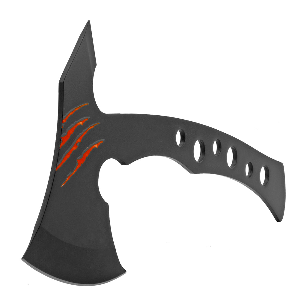 Introducing the perfect tool for an adventure: a 10" overall length black throwing axe. Crafted with 440 stainless steel blade and a 8" black handle, with a flashy red scar on the blade. Plus, the included nylon sleeve keeps it secure and ready for your next outdoor escapade.