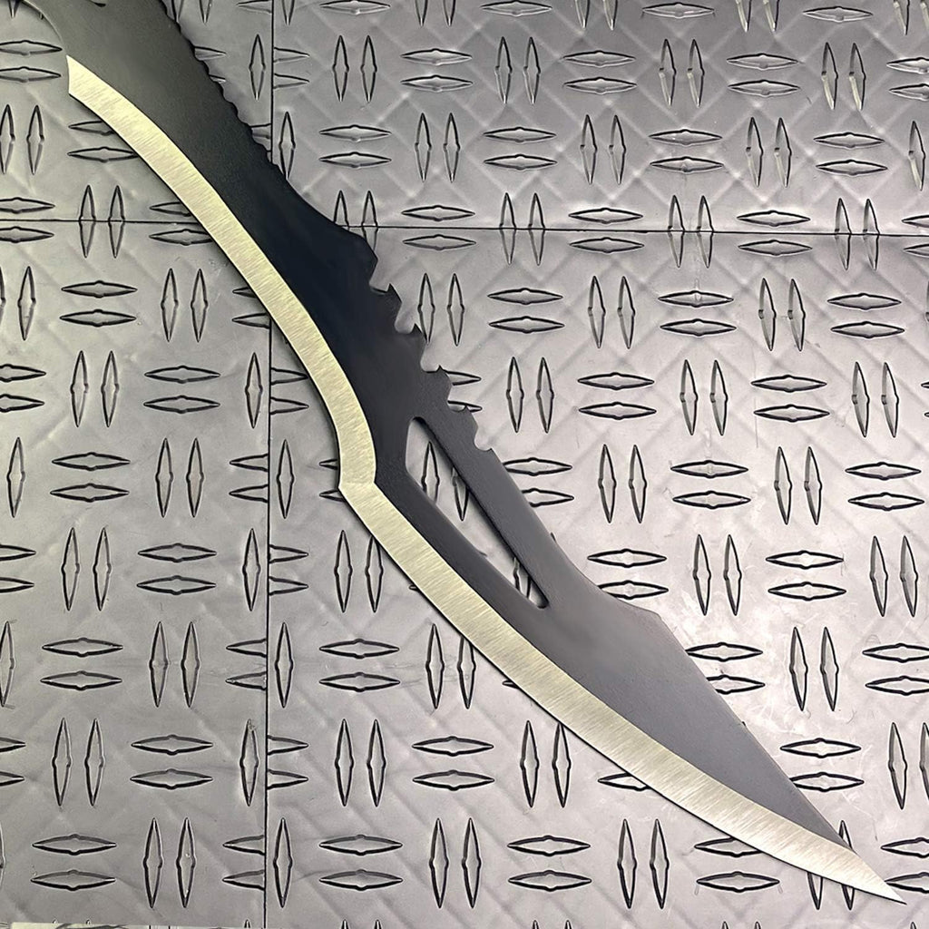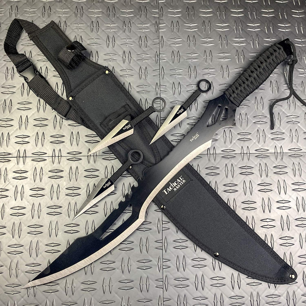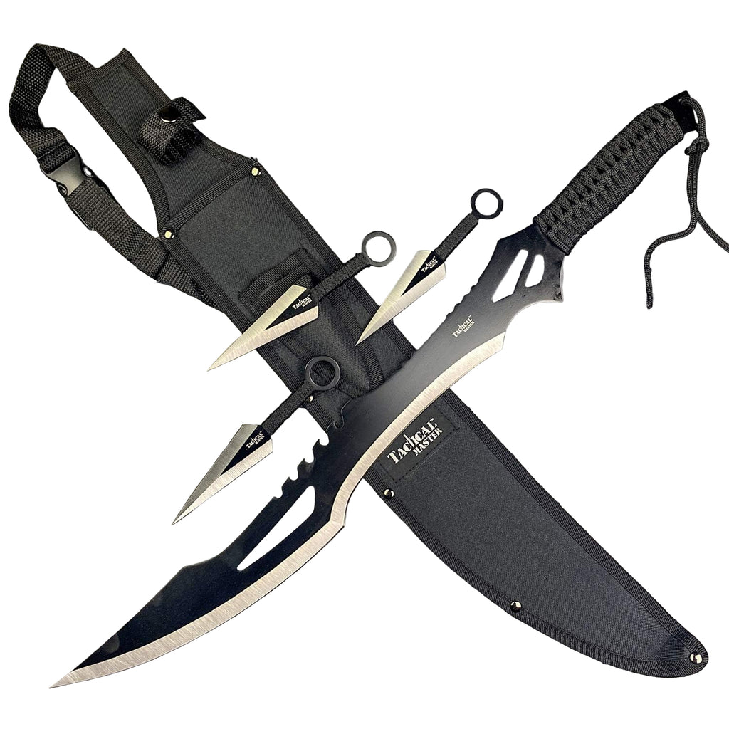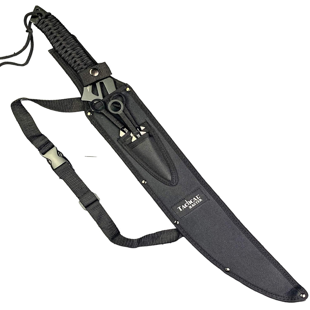 This 26" length 440 stainless steel machete & 3 x 6.5" throwing knife set is sure to impress! The black machete features cut outs on the blade and finished with a silver metallic blade edge. The rear of the blade has a saw back section. A nylon cord wrapped handle finishes this machete. Three kunai 6.5" throwing knives are the perfect compliment to the machete finished in the same silver metallic edge finish and cord wrapped handles. . All three kunai and machete fit comfortably in the purpose fit heavy duty black nylon sheath with shoulder strap for ease of transport.