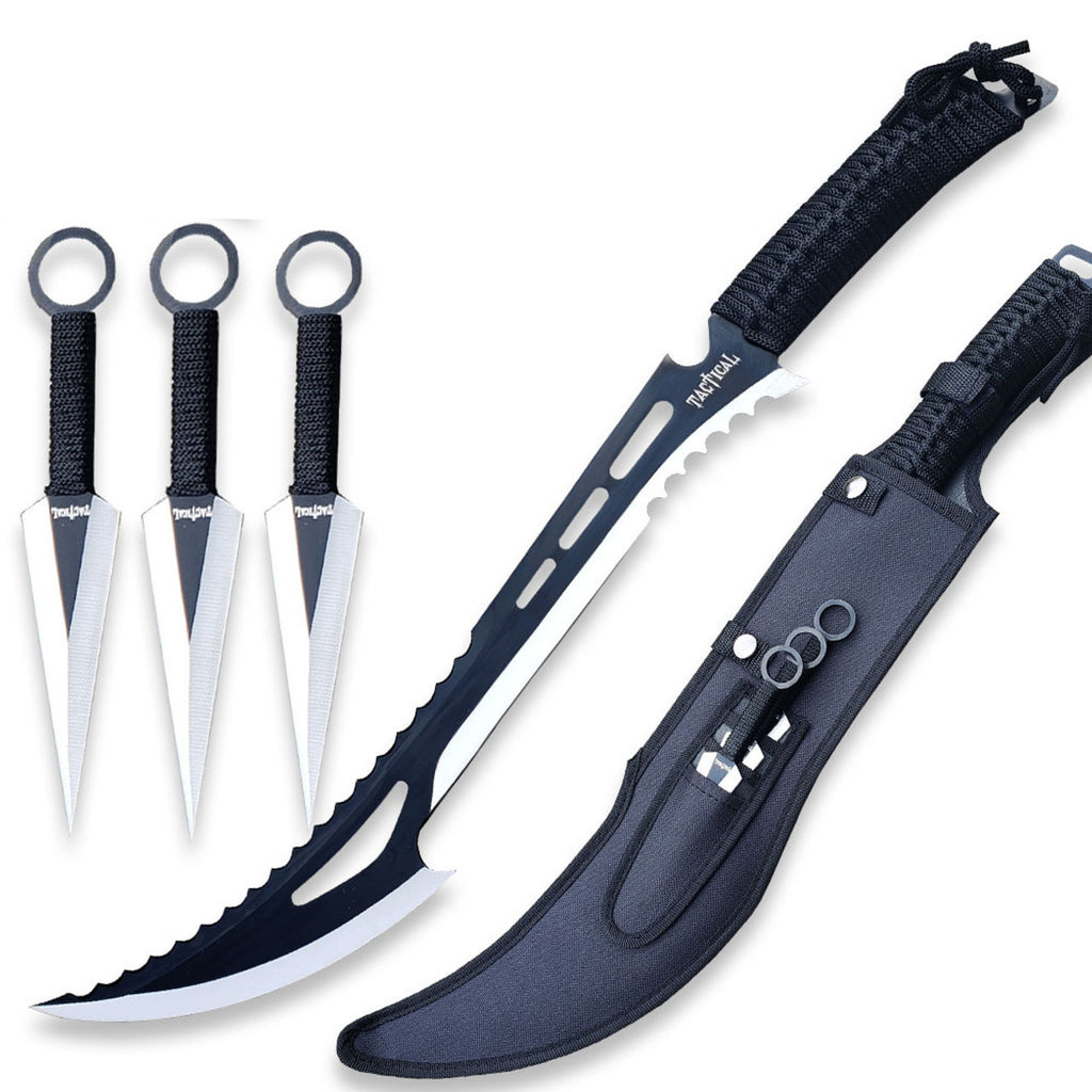 Love the outdoors? Our Tactical Master 26" Machete with 3 x 6" throwing knife is perfect for your next adventure. This Machete Sword is beautifully styled and finished in silver metallic trim and includes 3 throwing knives. This full tang machete sword is made from 440 Stainless Steel. The handle is wrapped cord for additional grip and control. Comes with a Nylon shoulder carry case. Perfect for any sword or knife collecting enthusiast.
