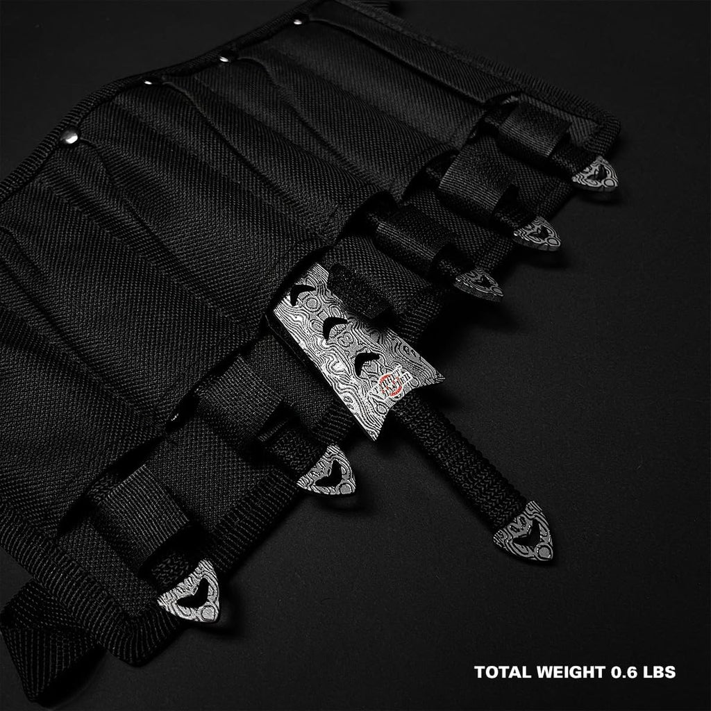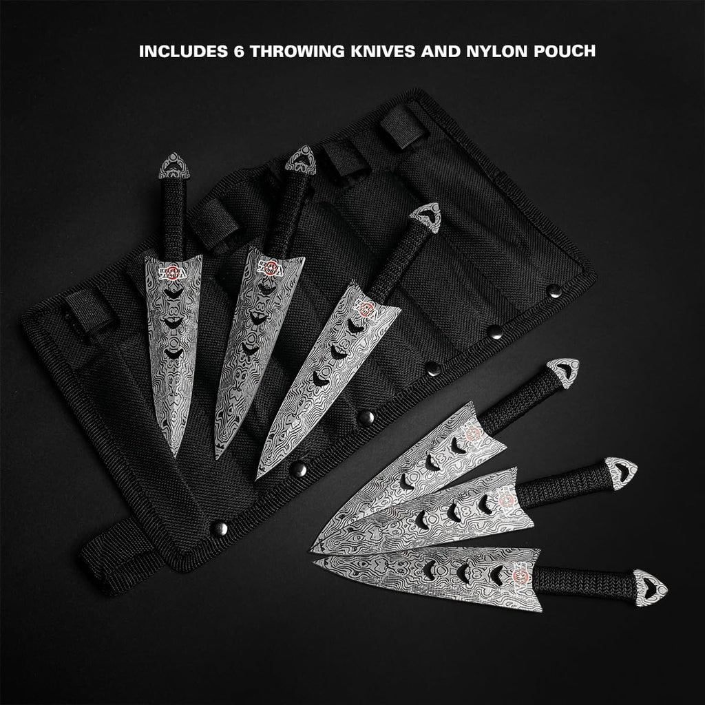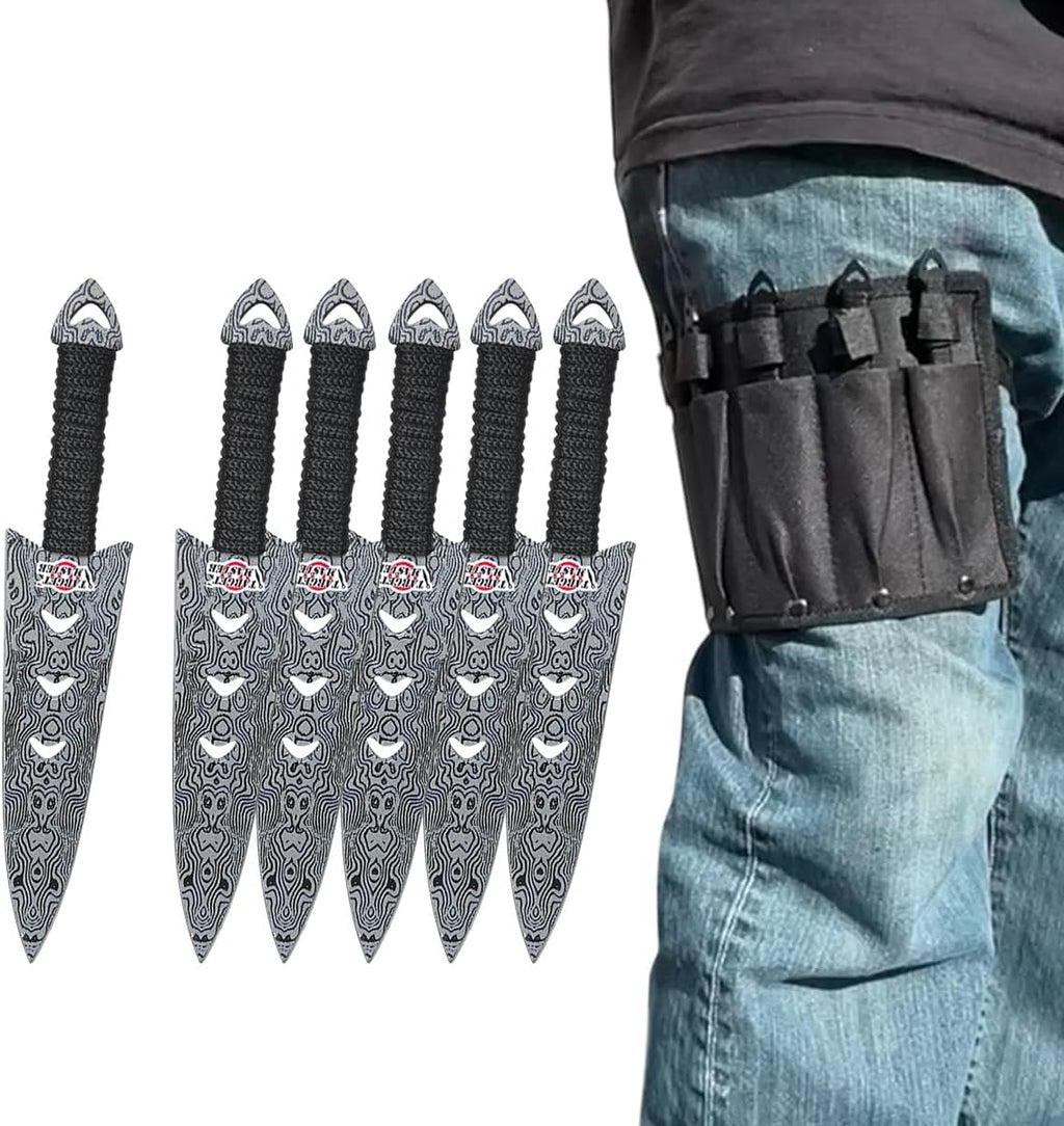 Feel the power of these handmade Target Master Falcon 6 PC 6" overall Arrow Head Throwing Knife Set. The 440 stainless steel blades and arrowhead style promise precision accuracy and excitement! With a 3" damascus print blade and nylon wrapped handles, each knife is designed for optimal grip and superior and superior performance. Plus a nylon pouch that can attach to your leg for easy carrying. Unleash your skills with this remarkable set - are you ready?