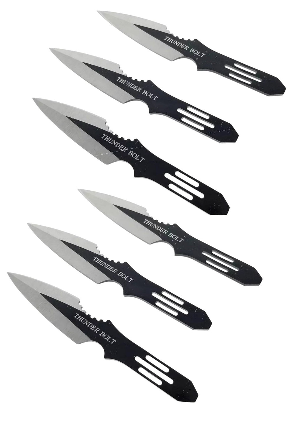 This 5.5" overall 6 piece black throwing knife set is designed for maximum accuracy and offers razor-sharp blades for precision targeting. Ideal for skill-building and practice, each knife features a 2.5" blade and a 5.5" overall length. The 6 piece knife set features black vented handles and black and silver jaw blades for added stability and accuracy.