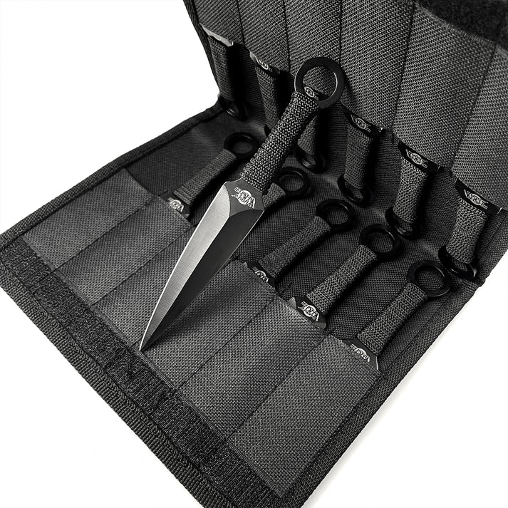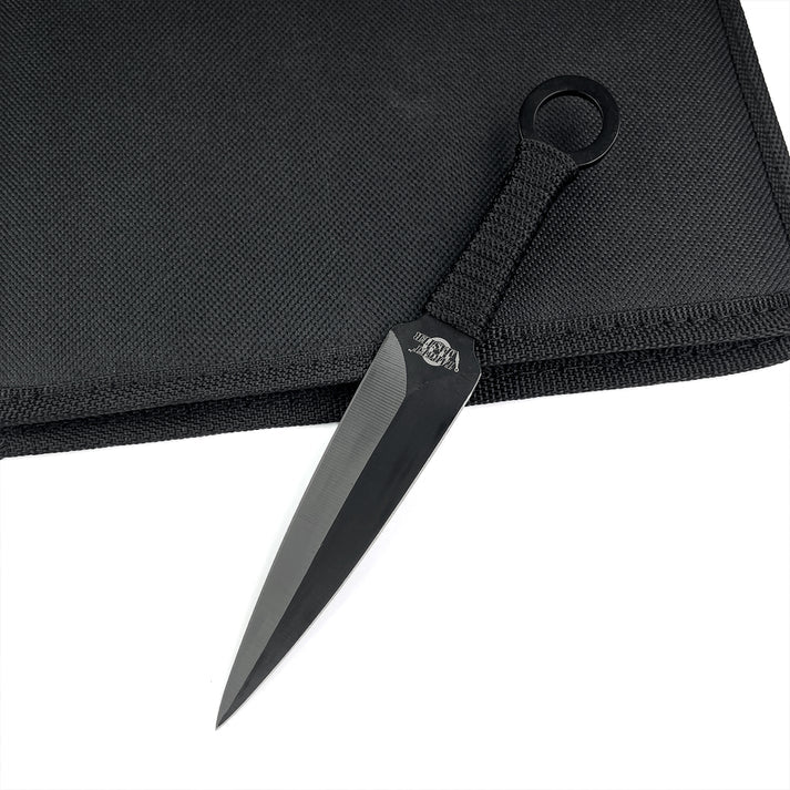 This Target Master 8 1/2" Ninja Kunai set contains 12 black stainless steel kunai throwing knives, perfect for training or practice in martial arts. The kunai have corded handles and measures 8 1/2" overall. The set also includes a nylon pouch for secure storage and transport. Stay sharp with this spear point kunai set!
