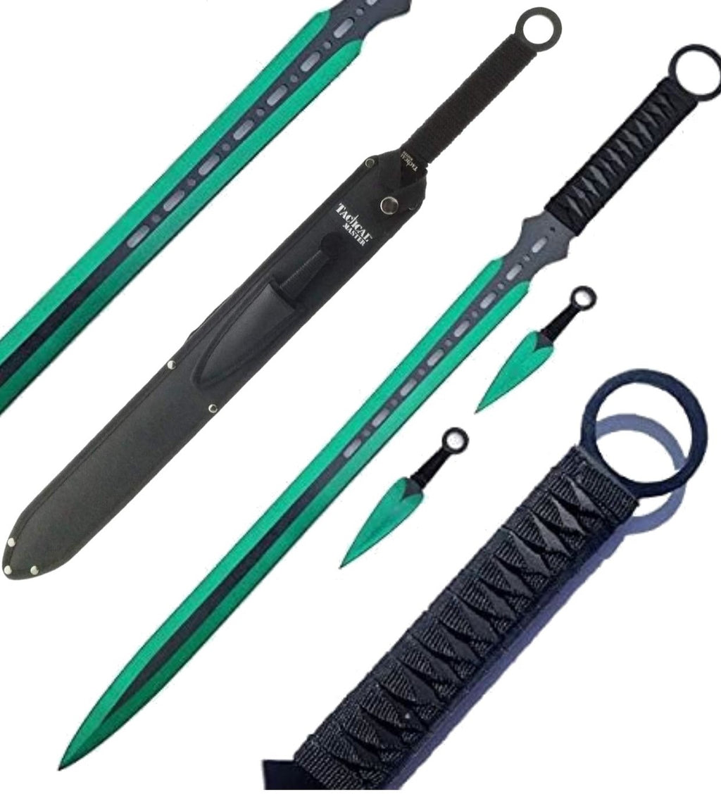 Introducing the Tactical Master 27" Machete with 2 x 6" throwing knives – perfect for adventurous outdoorsmen. The 440 stainless electro green machete comes with a nylon sheath and two 6" throwing knives, so you'll be equipped and ready to go. Whether you're trekking through the jungle or slicing through thin branches, you can count on it to provide superior performance. Get the Tactical Master and unleash your adventure!