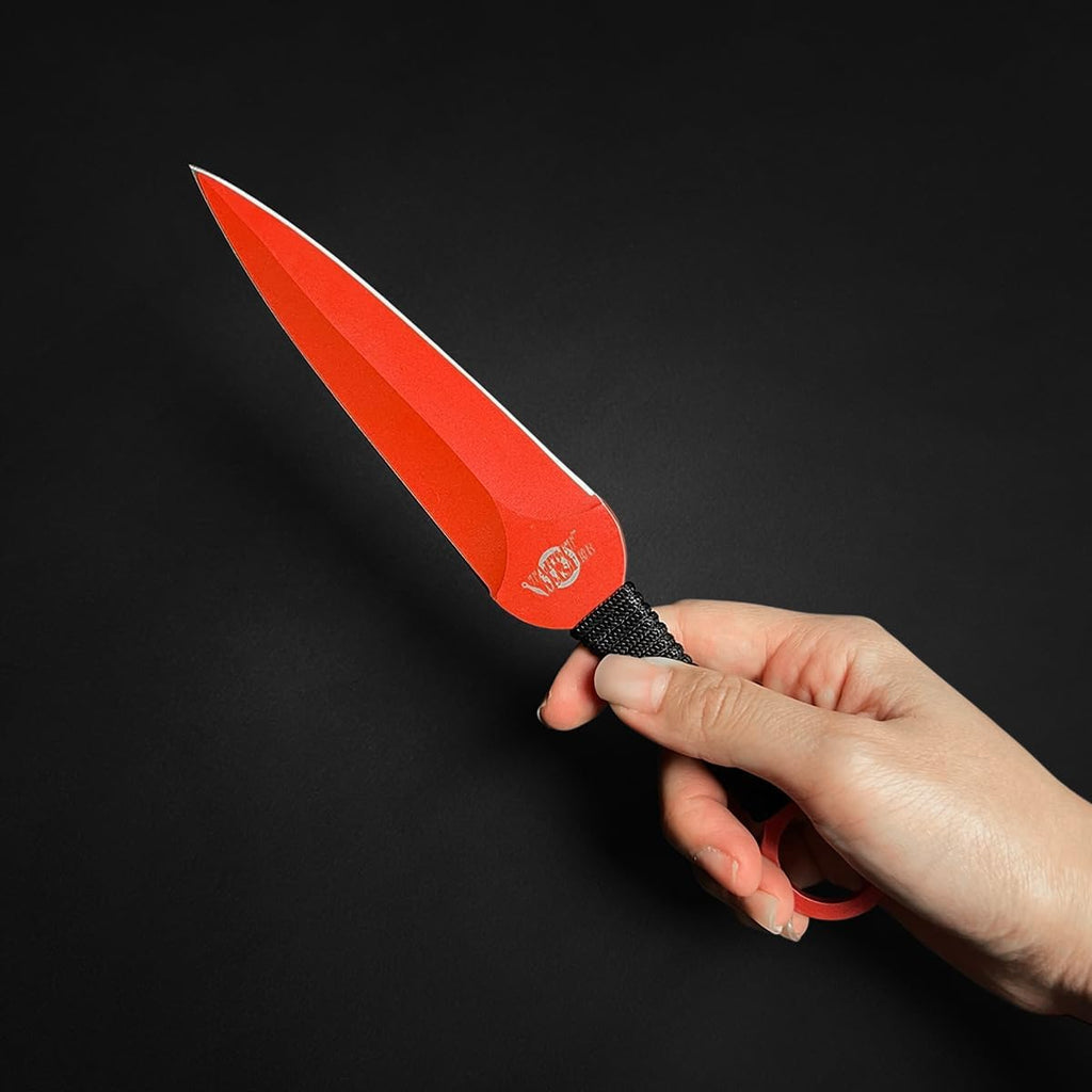 The Target Master 6 piece Blue & Red 9" Ninja Kunai Set with paper target is crafted from 440 stainless steel for lasting quality and durability. The 6 pieces set includes kunai-style throwing knives in red and blue, a sheath, and paper dart board. With 9" overall length, this set provides a precise and reliable throwing experience.